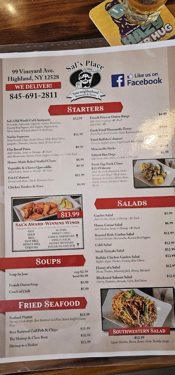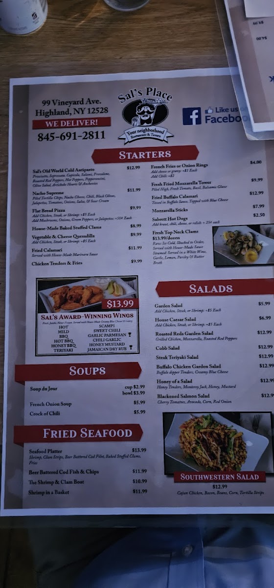 Seafood lovers will relish the Seafood Platter, which combines shrimp, clam strips, and beer-battered cod, all cooked to perfection. Customers like Stephanie and Samantha rave about their experiences, highlighting dishes like the blackened salmon salad and 99 Vineyard Ave Burger. With a welcoming atmosphere and attentive service, Sal's Place is a gem that inspires culinary delight with every visit. Whether for lunch, dinner, or a casual snack, this hidden treasure is not to be missed!